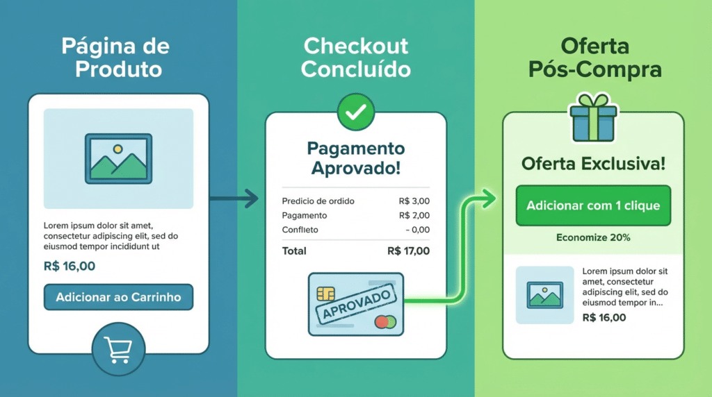 No upsell pós-compra, a venda principal já aconteceu. O pedido está garantido. Agora você entra com uma oferta pensada para: