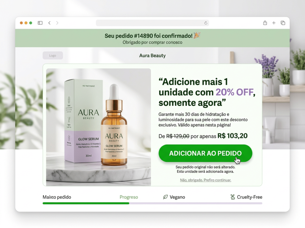 Upsell pós-compra é uma oferta extra que aparece para o cliente logo depois que ele finaliza o pedido na sua loja. A compra principal já foi feita, o cartão já foi aprovado, e então surge uma página com uma oferta complementar que ele pode aceitar com 1 clique.