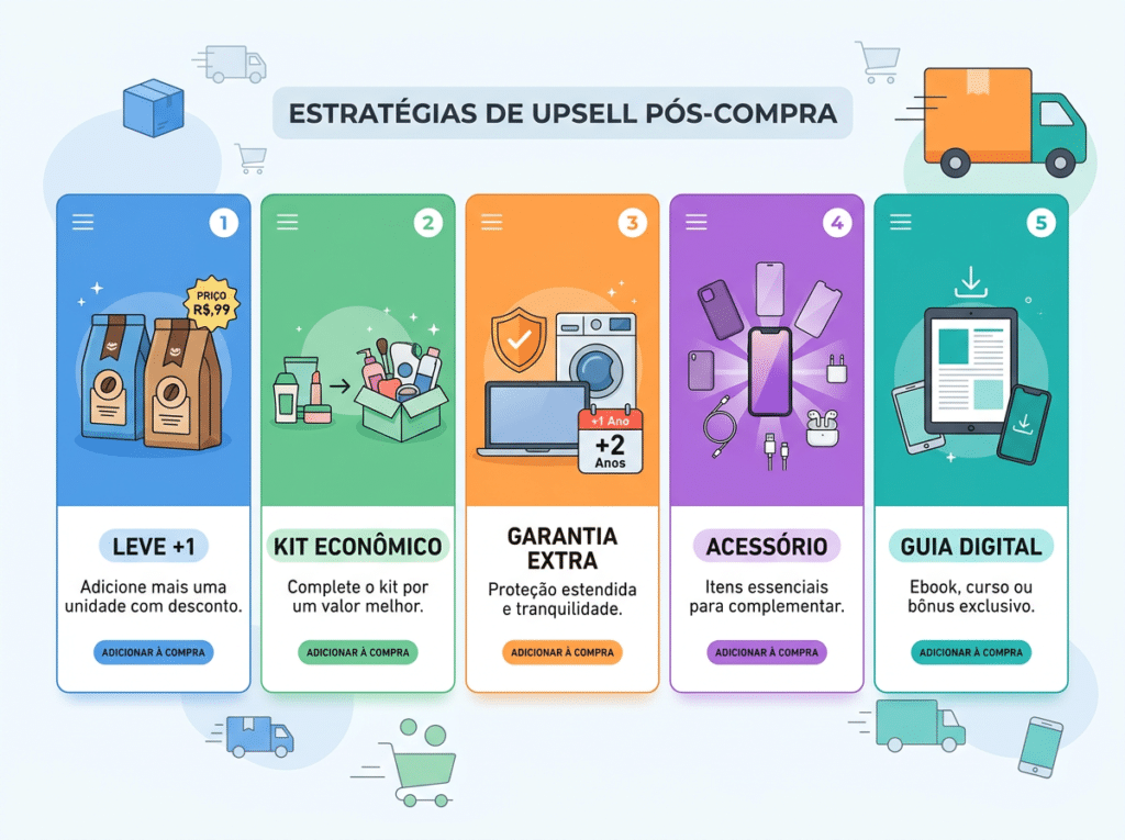 A seguir, alguns tipos de oferta que funcionam muito bem como upsell pós-compra, com lógica, quando usar e exemplos rápidos em nichos diferentes.